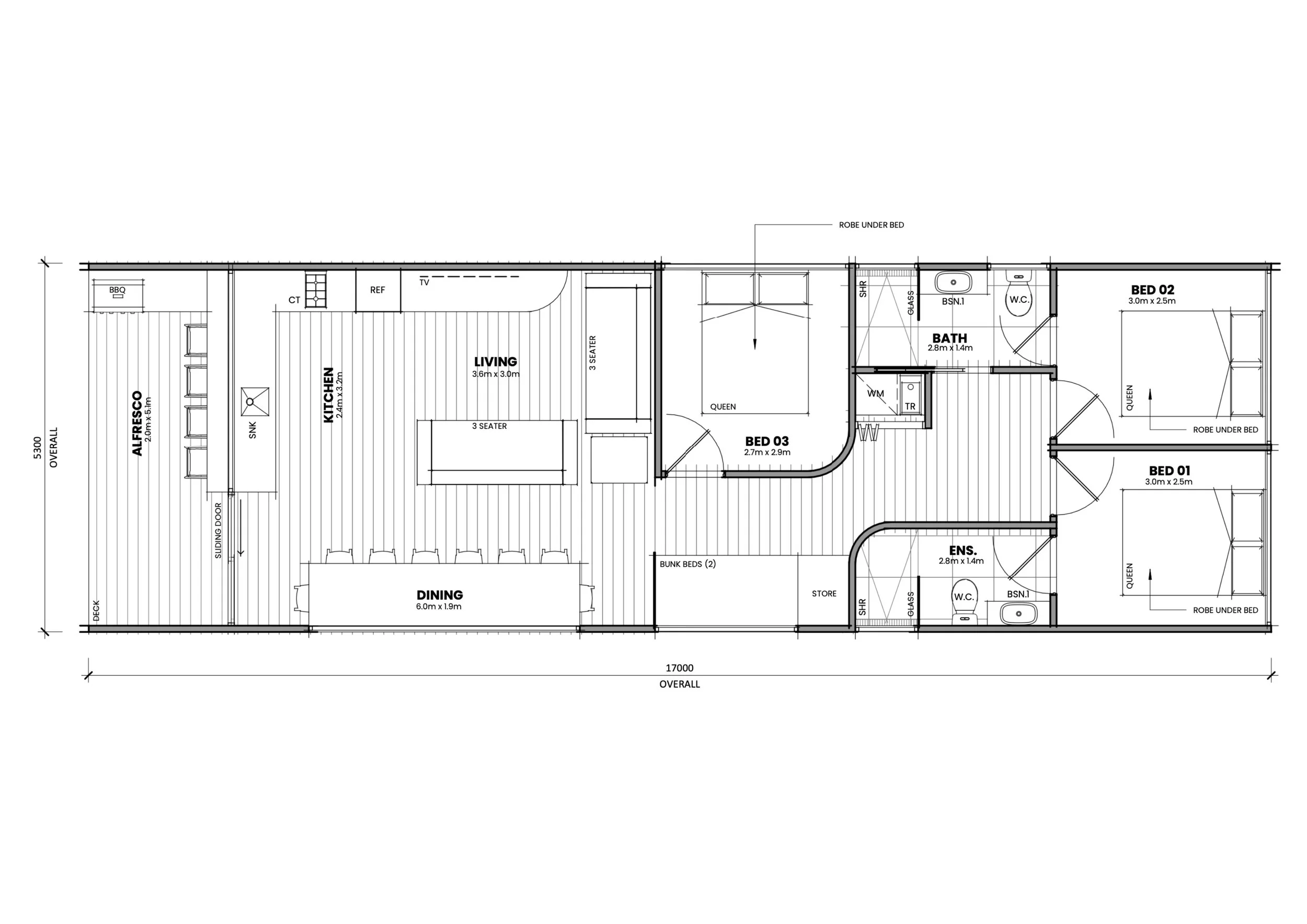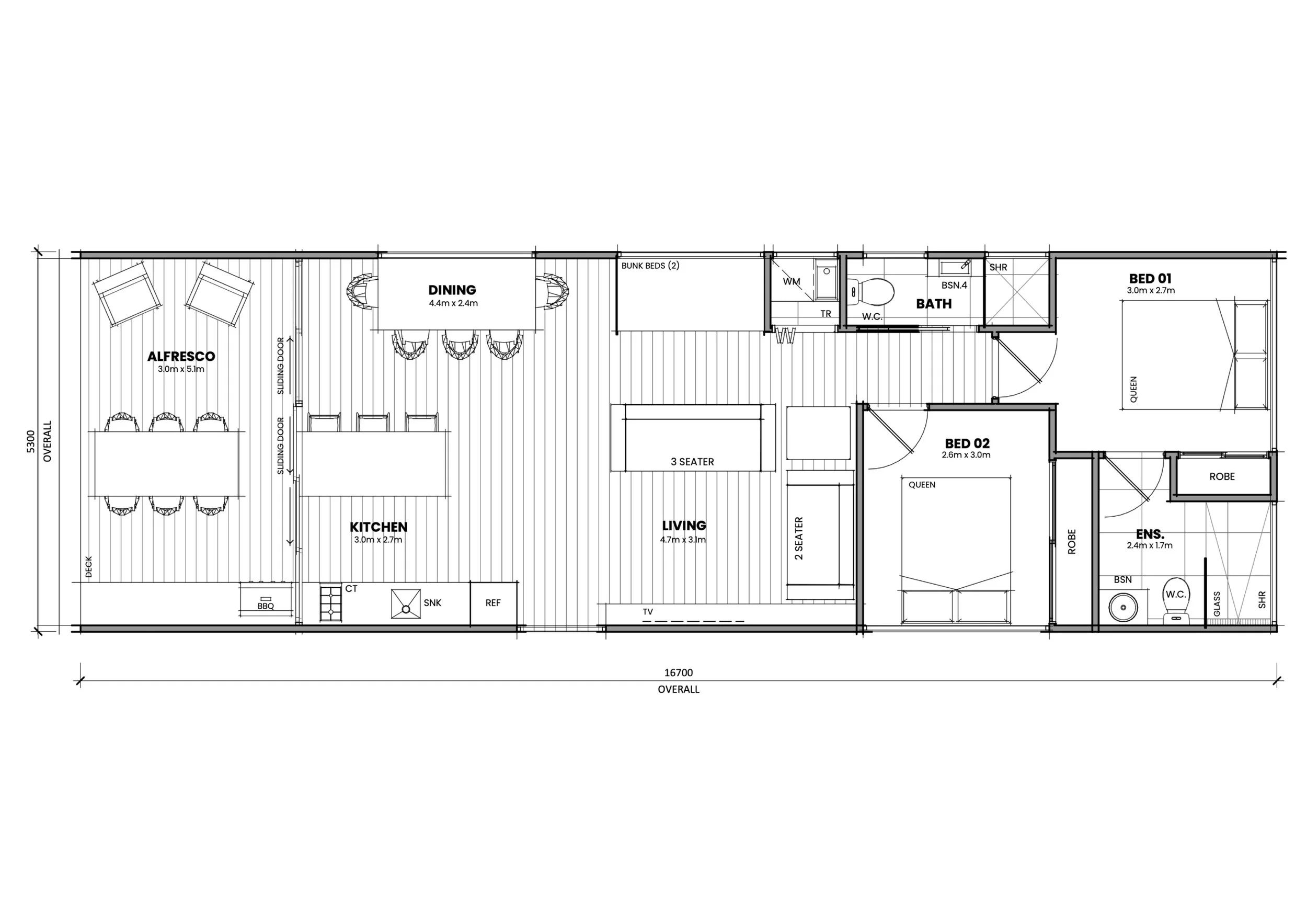 The Bellarine sleeps 6 with 2 queen sized bedrooms and space for a set of bunk beds. Included is a large alfresco area designed for outdoor living, keeping the larger family and those warm summer nights in mind. All of our cabins come standard with double glazed windows, Polytex soft close joinery, designer fixtures and fittings, and many more. See below to read more.