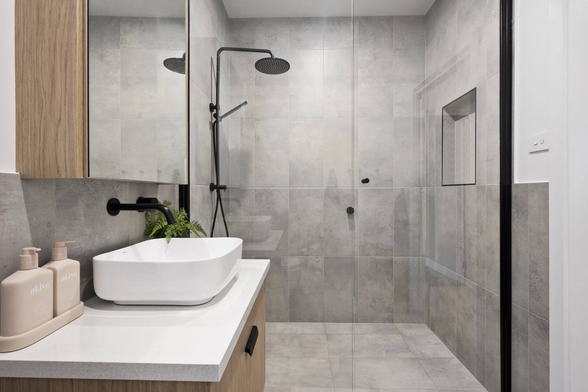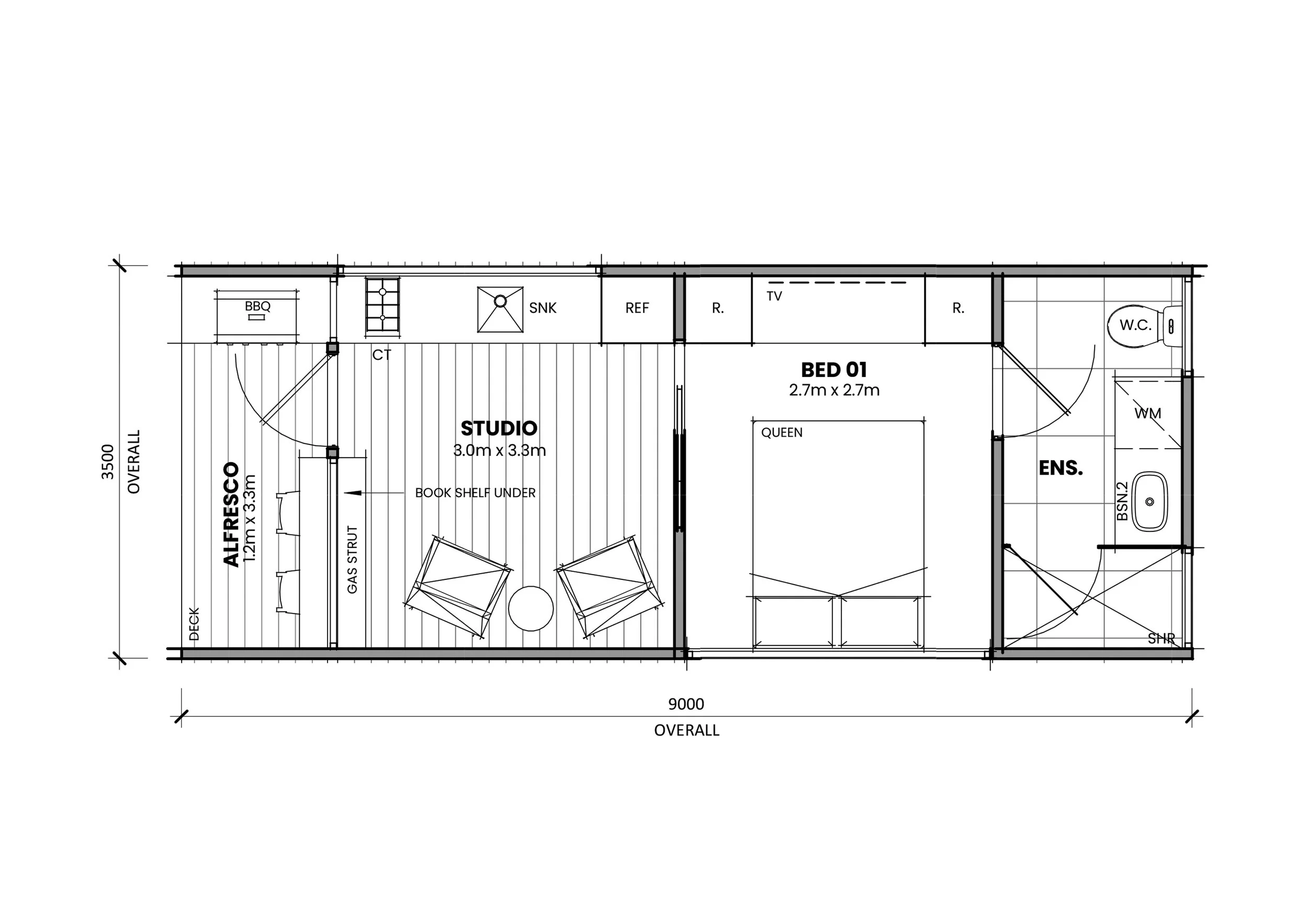 The Gove is our studio cabin contained with all of your essential living. It boasts a separate bedroom, ensuite including space for a washing machine, and generous living and alfresco spaces. Designed for smaller lots, it proves you don't need much space for a comfortable and stylish abode. The Gove is the perfect choice for any couple.